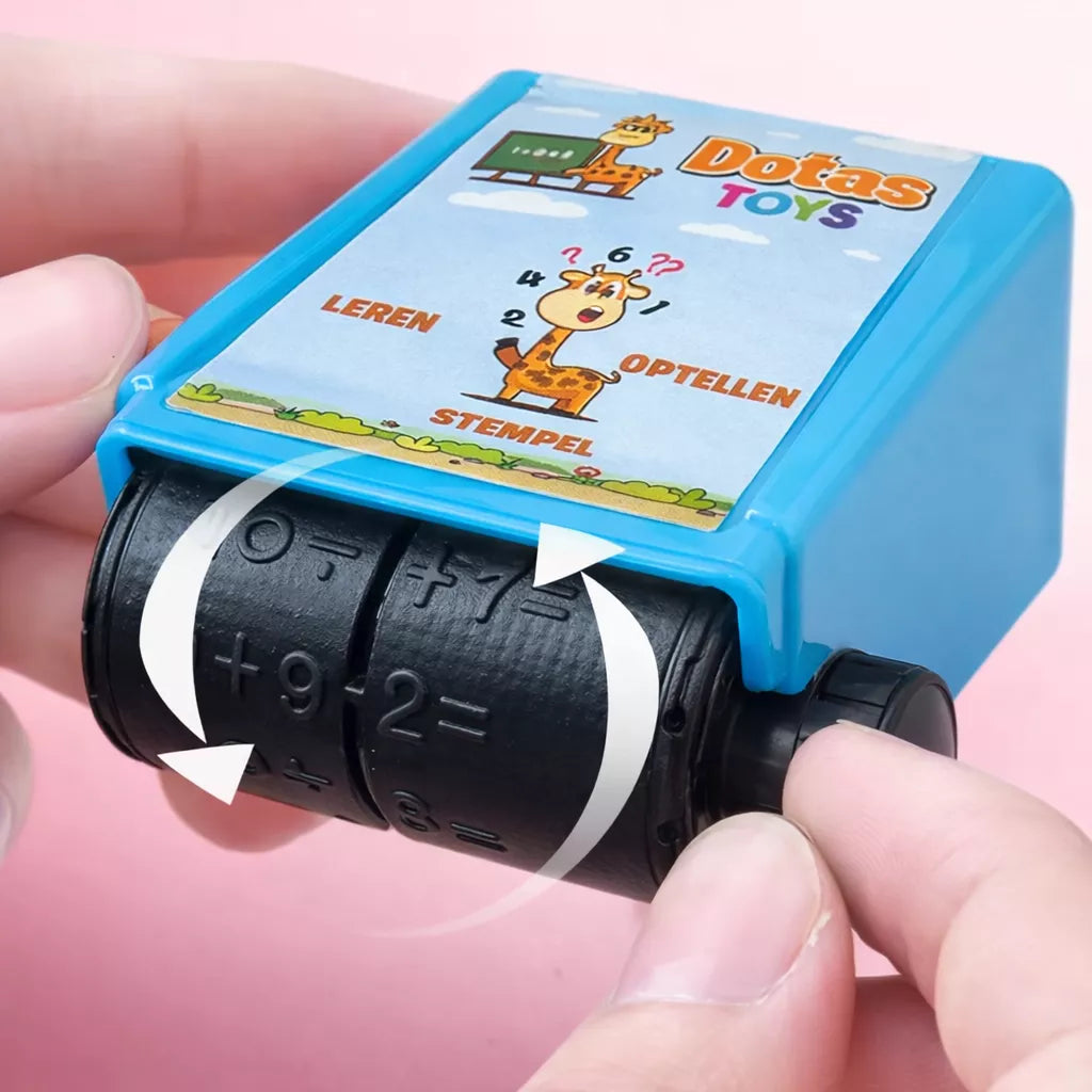 Rol de stempel over een leeg vel en je hebt meteen sommen. Draai aan de knop om nieuwe optelsommen te krijgen—zo blijft oefenen afwisselend en leuk.